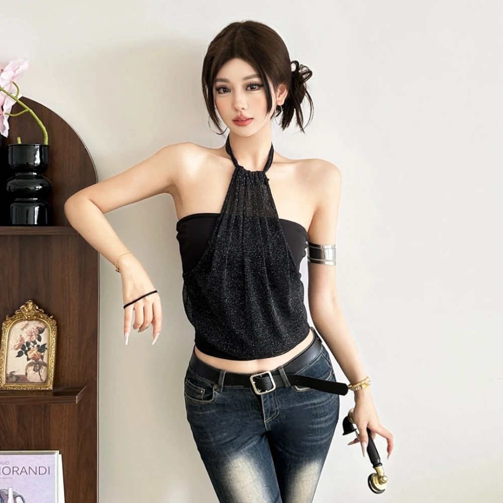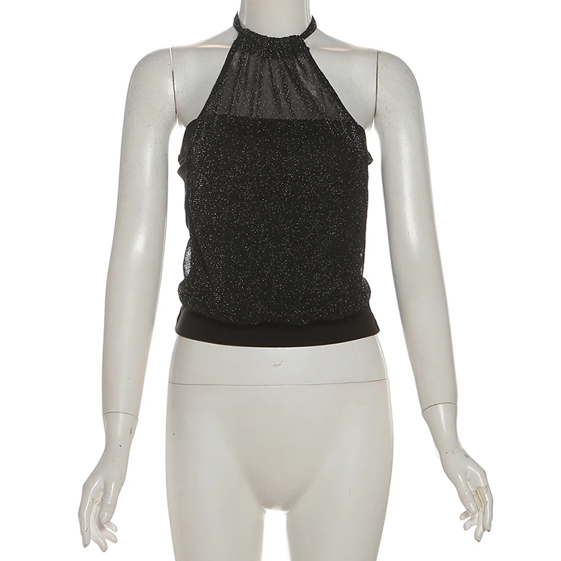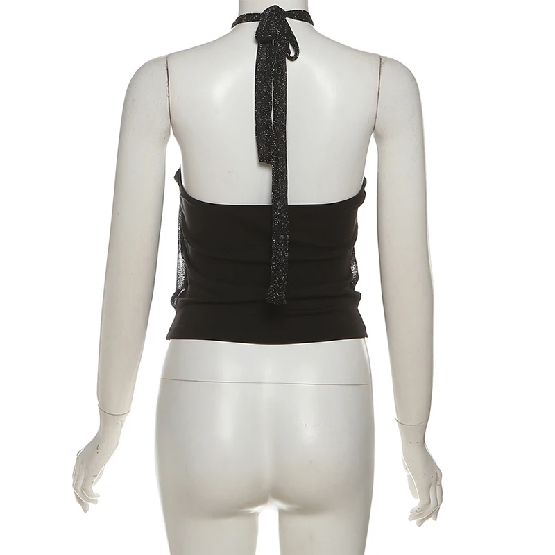 SylCue Shiny Mesh Patchwork Camisole Woman Halter Off Shoulder Backless Navel Exposed Hot Girls High Street Wild Style Tank Tops