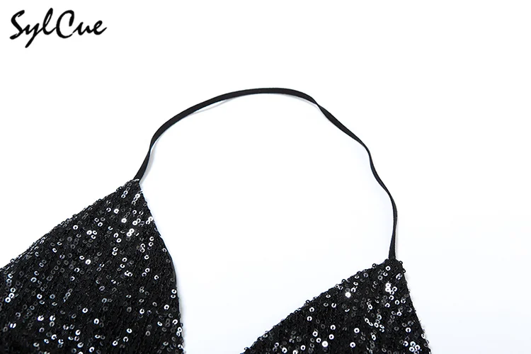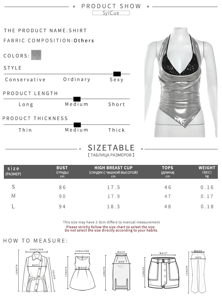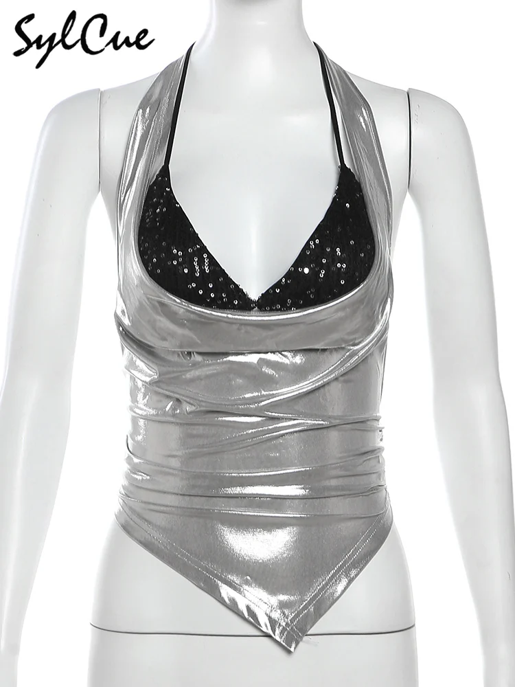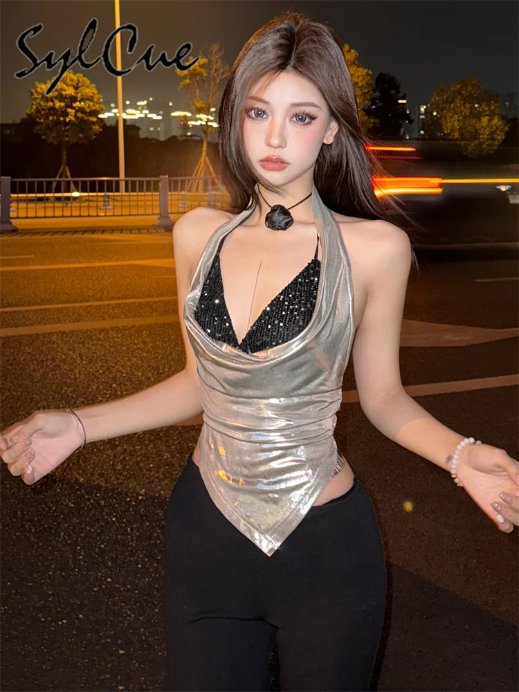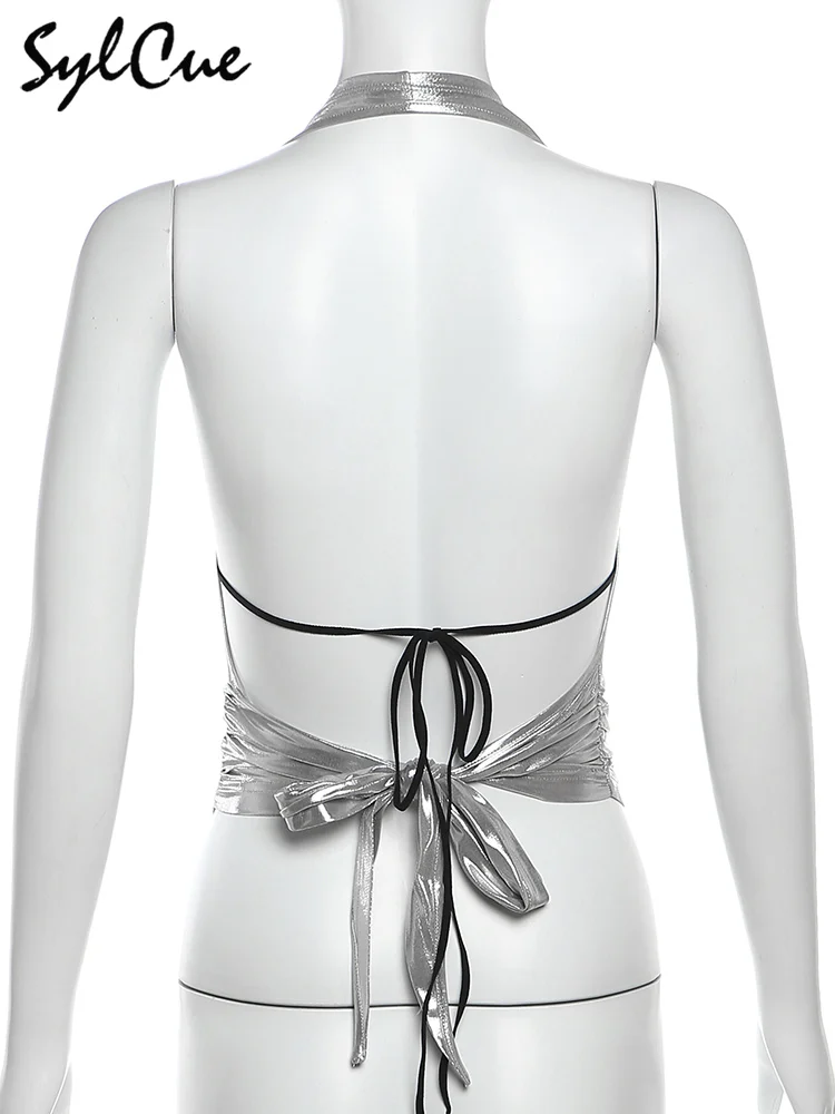 Sylcue Vintage silver All-Match Sweet Gentle Sexy Tight Hot High Street Fashionable Cool Women’s Backless Halter Vest